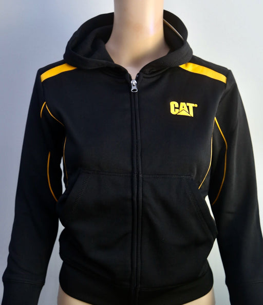 CAT Ladies Jacket with Hood. This Poly Cotton fleece Jacket has a hood and has pockets at the front. Right hand side arm has Caterpillar printed on...